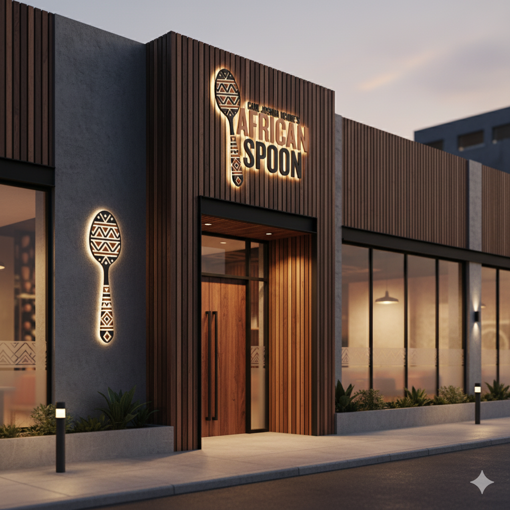 The Vision: Culinary Theatre & Storytelling on a Spoon Imagine stepping into a restaurant where the vibrant décor hums with modern African elegance, and a magnificent, glowing spoon icon emblazons the central open kitchen—the “Culinary Arena.” Here, food isn’t just served; it’s narrated. Each exquisite, single-bite dish inspired by Carl’s travels, Chef’s he has met and dishes he has tasted as a child (from fonio croquettes to hibiscus-cured fish tataki) arrives with a story, connecting diners to the rural African communities, indigenous ingredients, and time-honored traditions that inspired it. The experience is designed to be highly theatrical, engaging all senses.